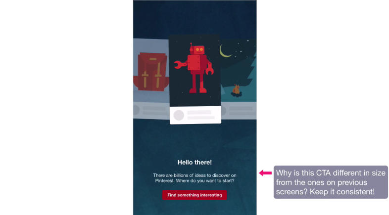 ここまでの作業で個人情報の登録は終わりで、次の画面ではユーザーがどんなピンを楽しむことができるのか、愉快なアニメーションで表示されます。赤いCTAボタンのおかげでどこを押して次に進めばいいのか分かりやすいです。私はこの画面には2つ改善点があると思っています。まず、CTAのためのリンクやボタンを前の画面と同じ大きさにするべきでしょう。なぜこの画面だと前のものより小さく表示するのでしょうか?もうひとつの点は、ピンのアニメーションを前のステップで選択した性別に合わせた実際の写真にすべきだということです。そうすれば、アプリを始めてすぐのユーザーに対してより一層、没入感を与えることができるでしょう。